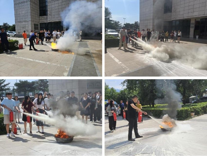 楼前空旷处对灭火器的种类和操作方法进行了演示,并模拟火灾现场对师生们进行了灭火器实操训练。