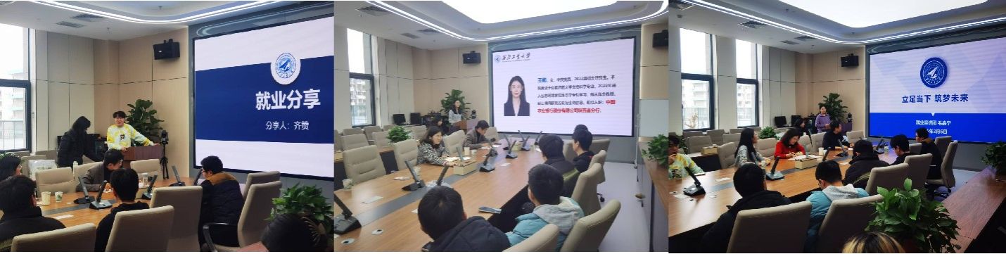 邀请了2025届两位毕业生代表现场分享就业经验:齐赞指出要善用就业信息网、招聘群等平台破除信息壁垒,借助网络资源提升面试技能;王彬结合自身求职经历,强调提前明确职业目标的重要性,并分享了常见面试问题的应对策略。