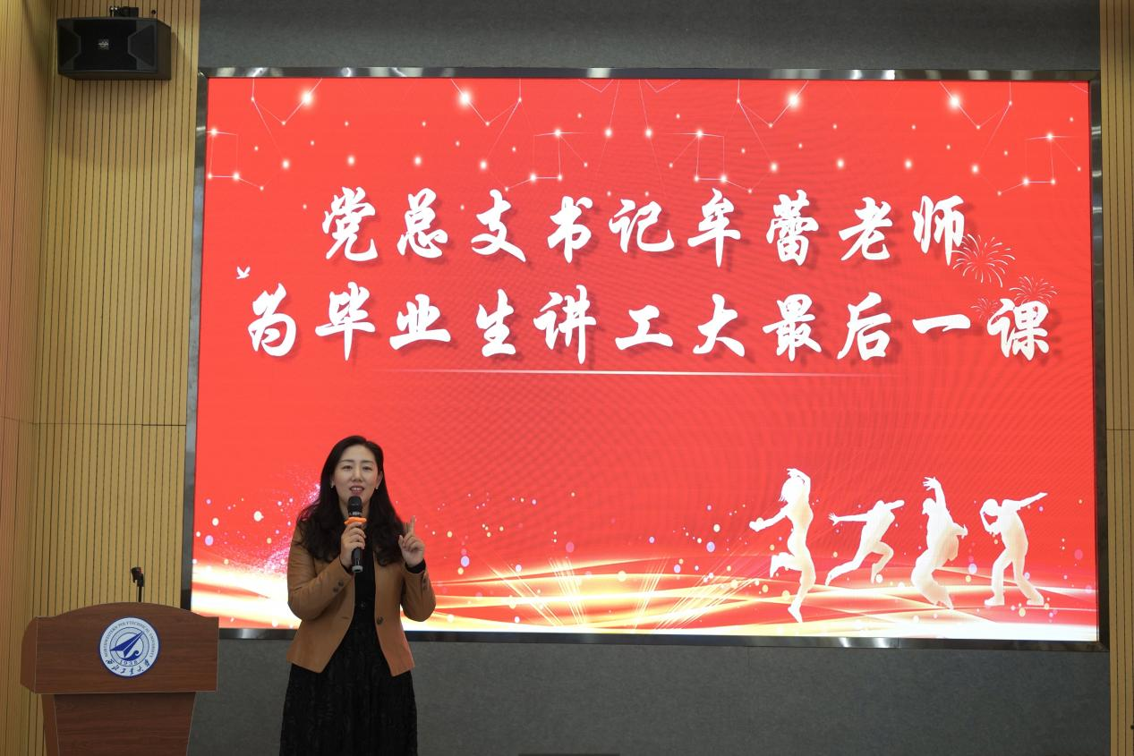 牟蕾以“爱国 励志 求真 力行”为主题,从重温工大建校历史、感受7mmtv 、学生风貌及寄语未来等几个方面,2019级硕士毕业班同学讲授了工大最后一课。讲话中回忆了同学们在校期间的点点滴滴,对学生们在教学科研实践等各方面的表现以及所取得的成绩给予了充分肯定和高度赞扬,对学生们的成长和进步感到由衷的欣慰和自豪,并向全体毕业生致以最热烈的祝贺,希望同学们秉承“公诚勇毅”的校训,弘扬“三实一新”的校风,做一个有崇高理想和高尚品格,能诚实守信、遵纪守法的人;做一个有决心、有恒心、有信心的人;做一个学识广博、视野开阔、勇于创新、敢于拼搏的人!