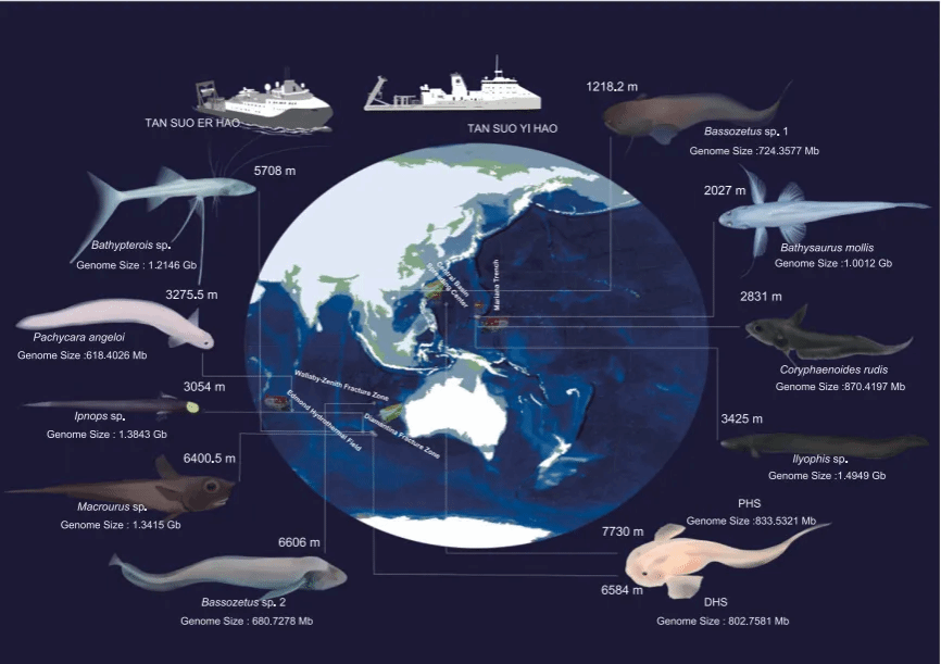 深海科学与工程研究所展开联合研究,经过多次深海巡航,采集了来自深海不同区域的11种鱼类样本。通过对这些样本的基因组数据进行深入分析,研究团队构建了深海鱼类的"生命进化树",揭示了脊椎动物征服深渊的历程。结果显示,少数类群的深海鱼类在1亿年前便开始适应深海环境,而大多数现存的深海鱼类则是在6500万年前的大灭绝事件后才进入深海区域。进一步的研究发现深海鱼类展现出较低的突变速率,并且与DNA修复及细胞膜功能维持相关的自然选择信号,同时对深海黑暗环境的也发生了不同层次的适应性改变。